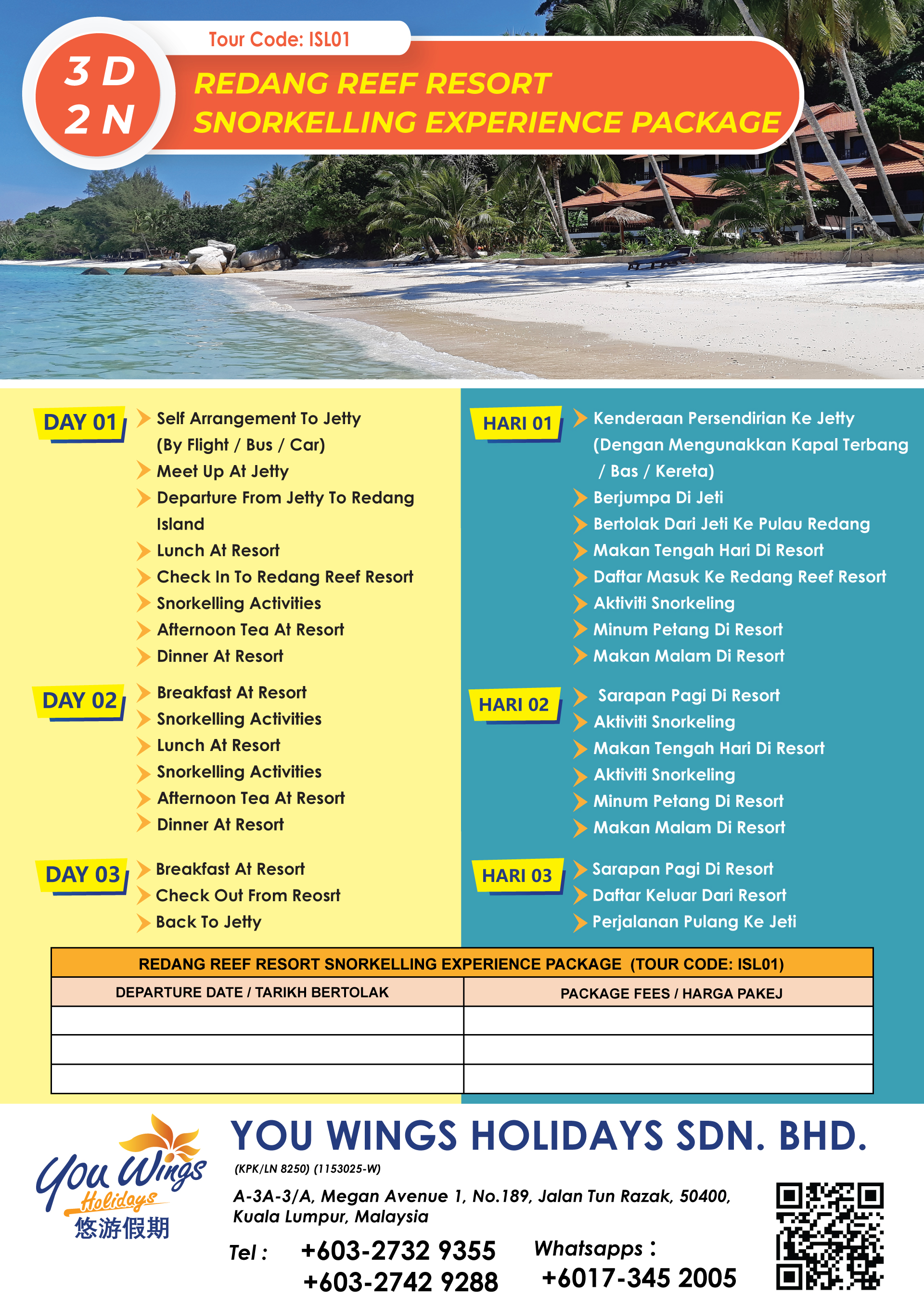 | 10. | 3D2N Redang Reef Resort Snorkeling Experience Package | ISL01 | RM375 | ||