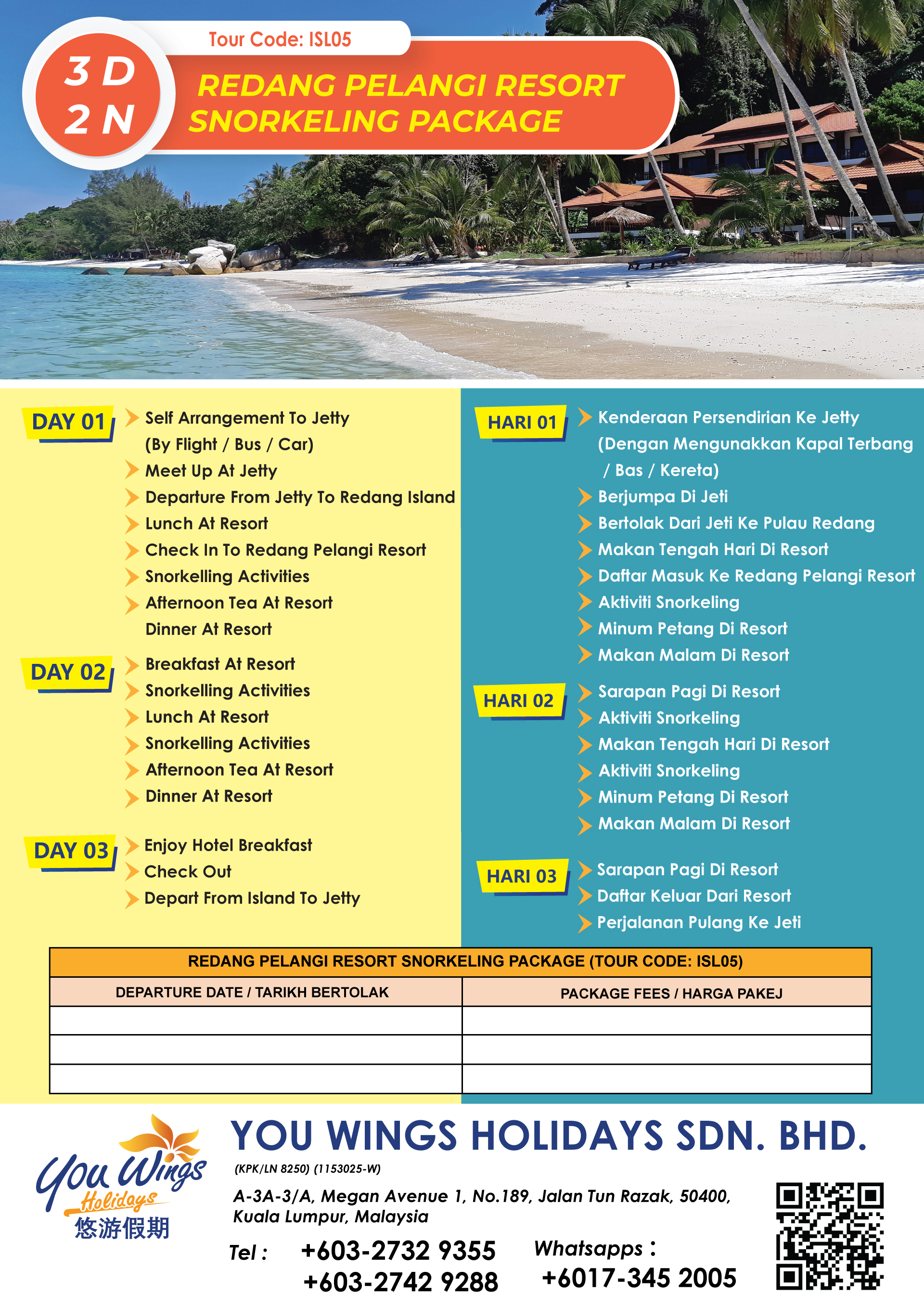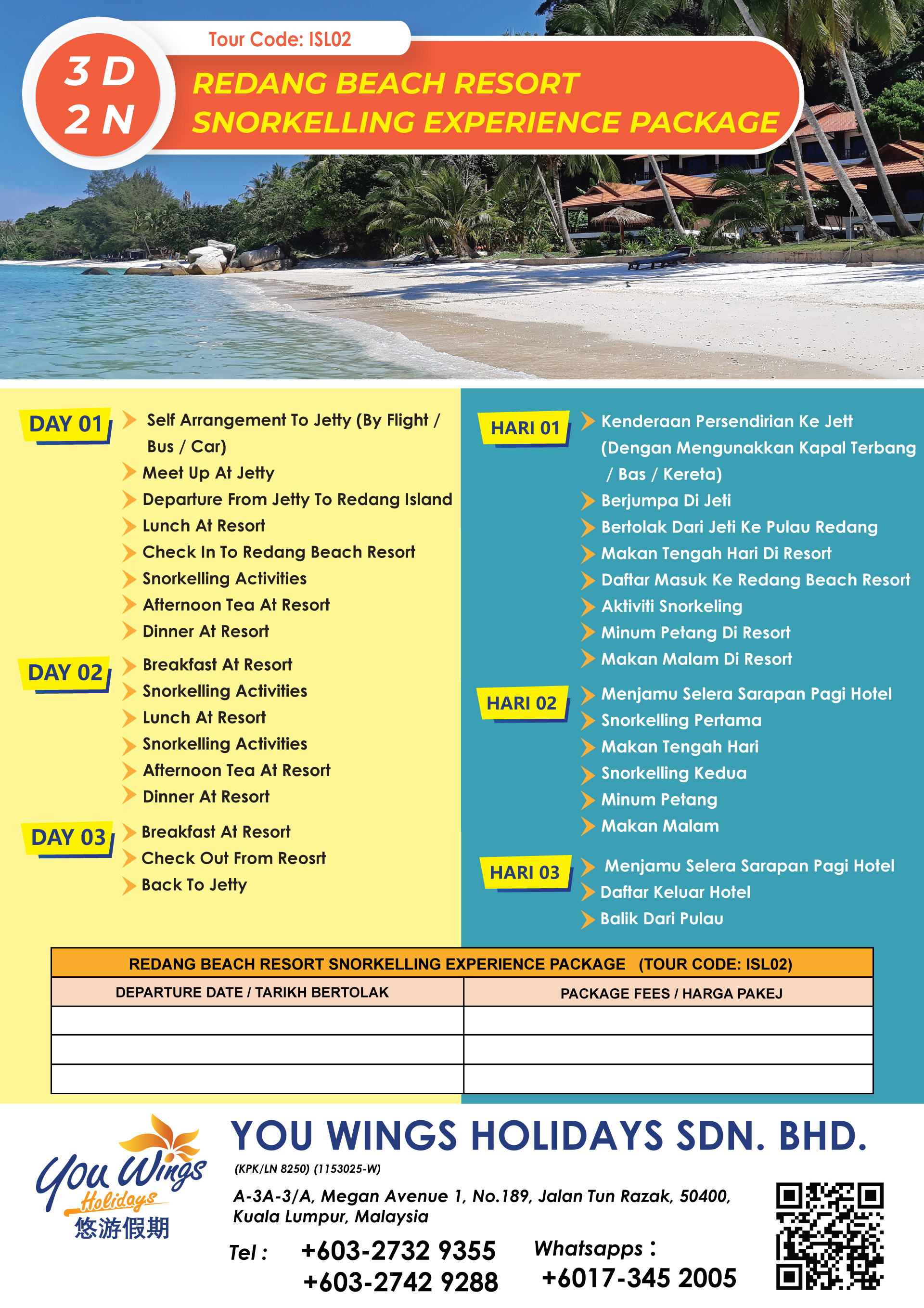 | 11. | 3D2N Redang Beach Resort Snorkeling Experience Package | ISL02 | RM399 | ||